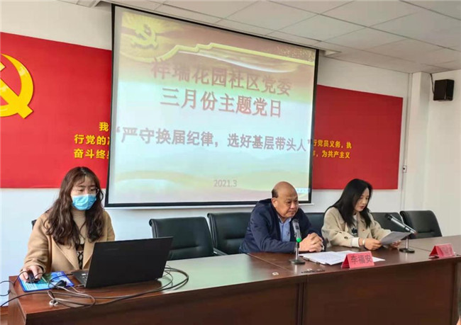 活動由祥瑞花園社區黨委書記李福安同志主持?;顒拥谝豁棧牲h員代表帶領參會人員宣讀入黨誓詞,“我志愿加入中國共產黨,擁護黨的綱領,……隨時準備為黨和人民犧牲一切,永不叛黨!”在場全體黨員慷慨激昂,用洪亮的聲音莊嚴宣誓。會議第二項,由周紅同志宣讀社區兩委換屆選舉的相關規定,由李福安同志宣讀社區兩委換屆的選舉辦法并做換屆選舉前的動員講話。作為“雙報到”黨員,我們通過此次主題黨日活動,學習到了社區兩委換屆選舉的相關知識和流程,參與其中讓我們對祥瑞花園社區黨務工作人員認真的工作態度和周全的活動組織肅然起敬,我們要向他們學習“把社區當家”的實干精神!